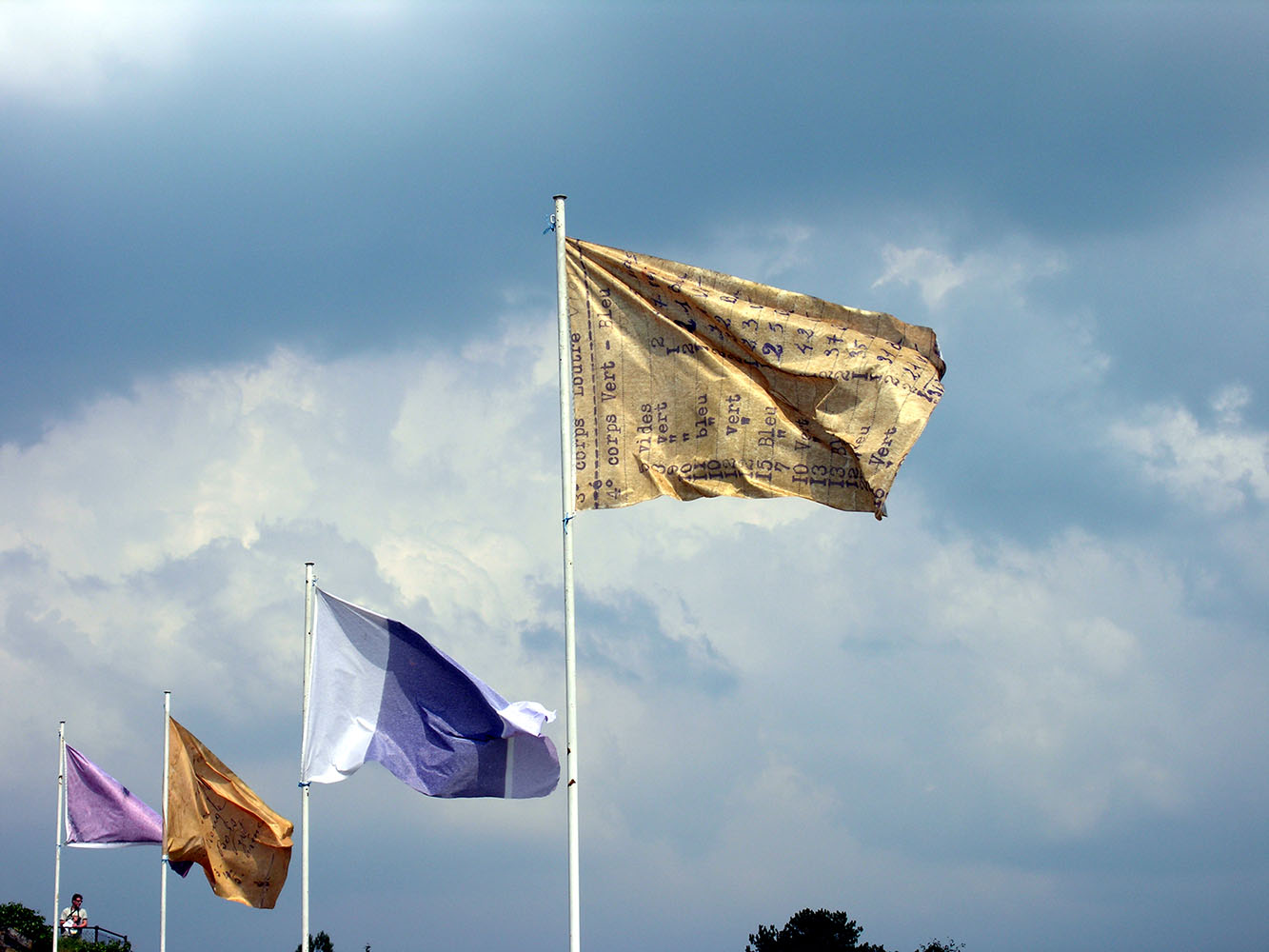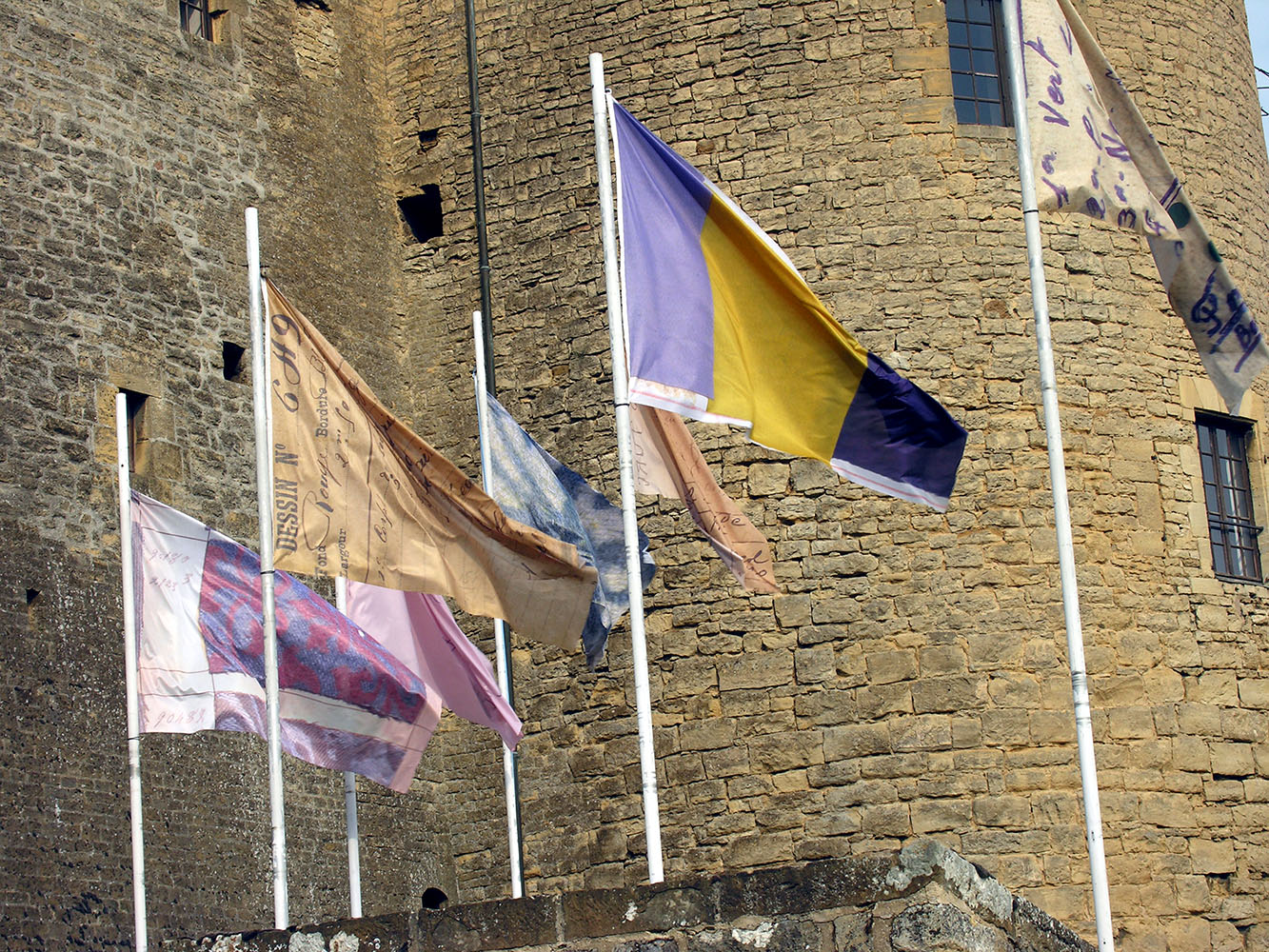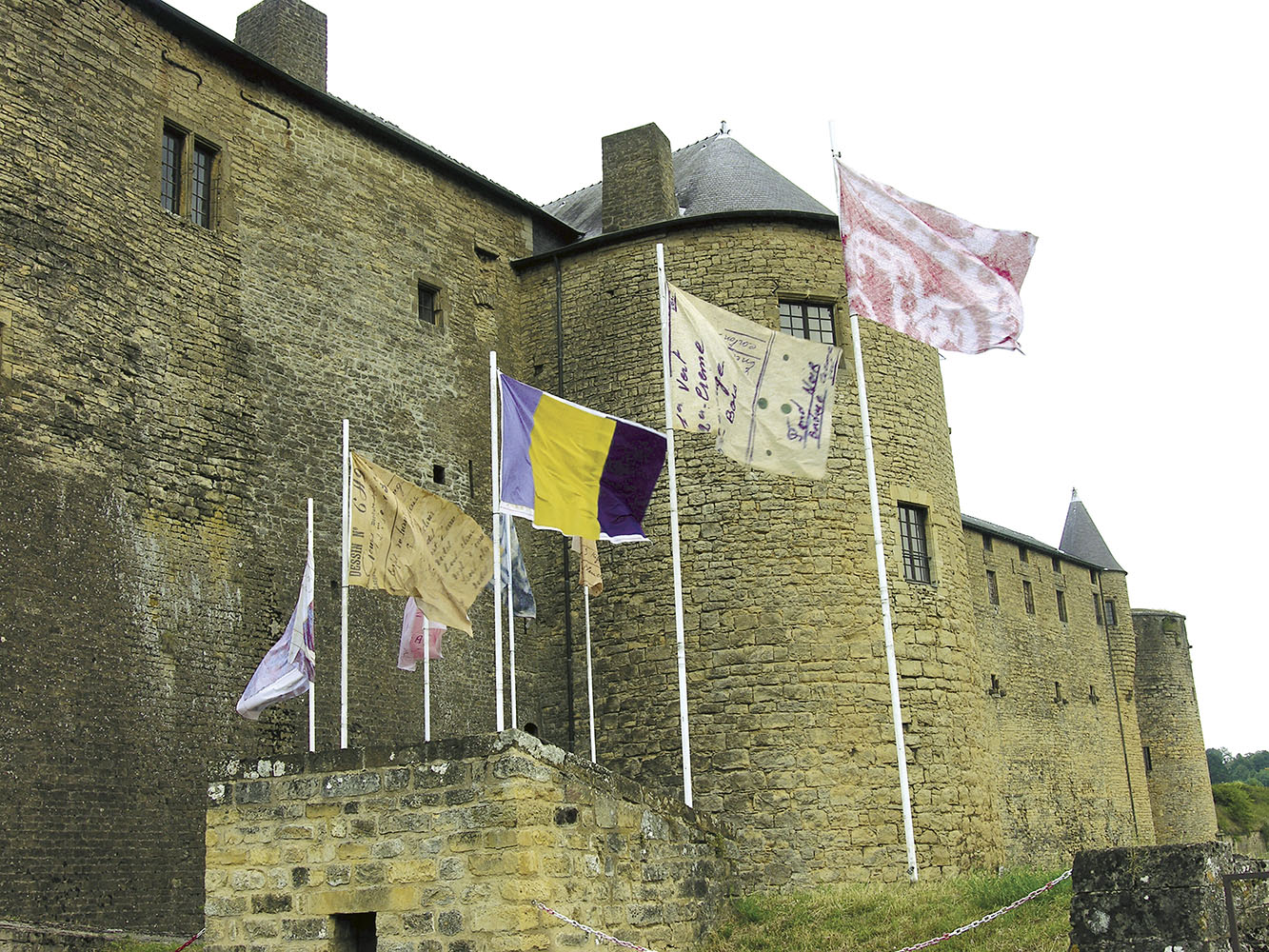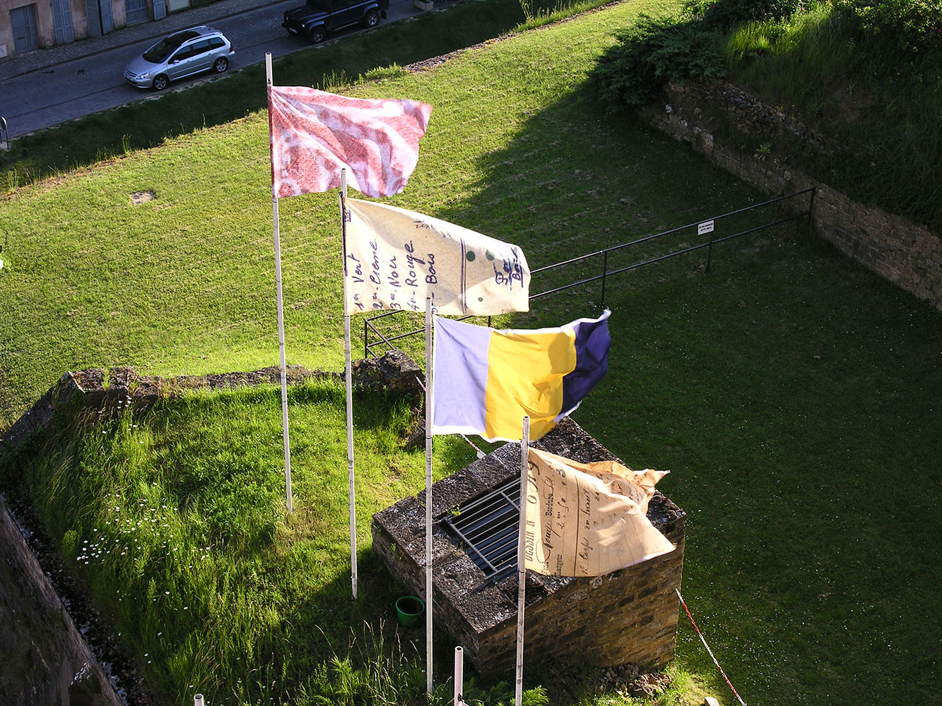 17 drapeaux, impression sur tissu drapeau, 150 x 225 cm chaque, installation château de Sedan.