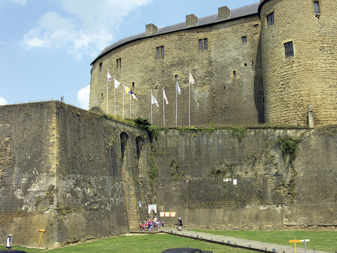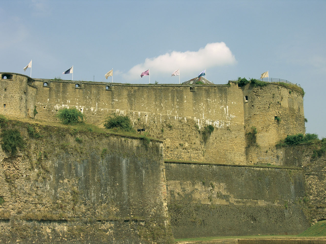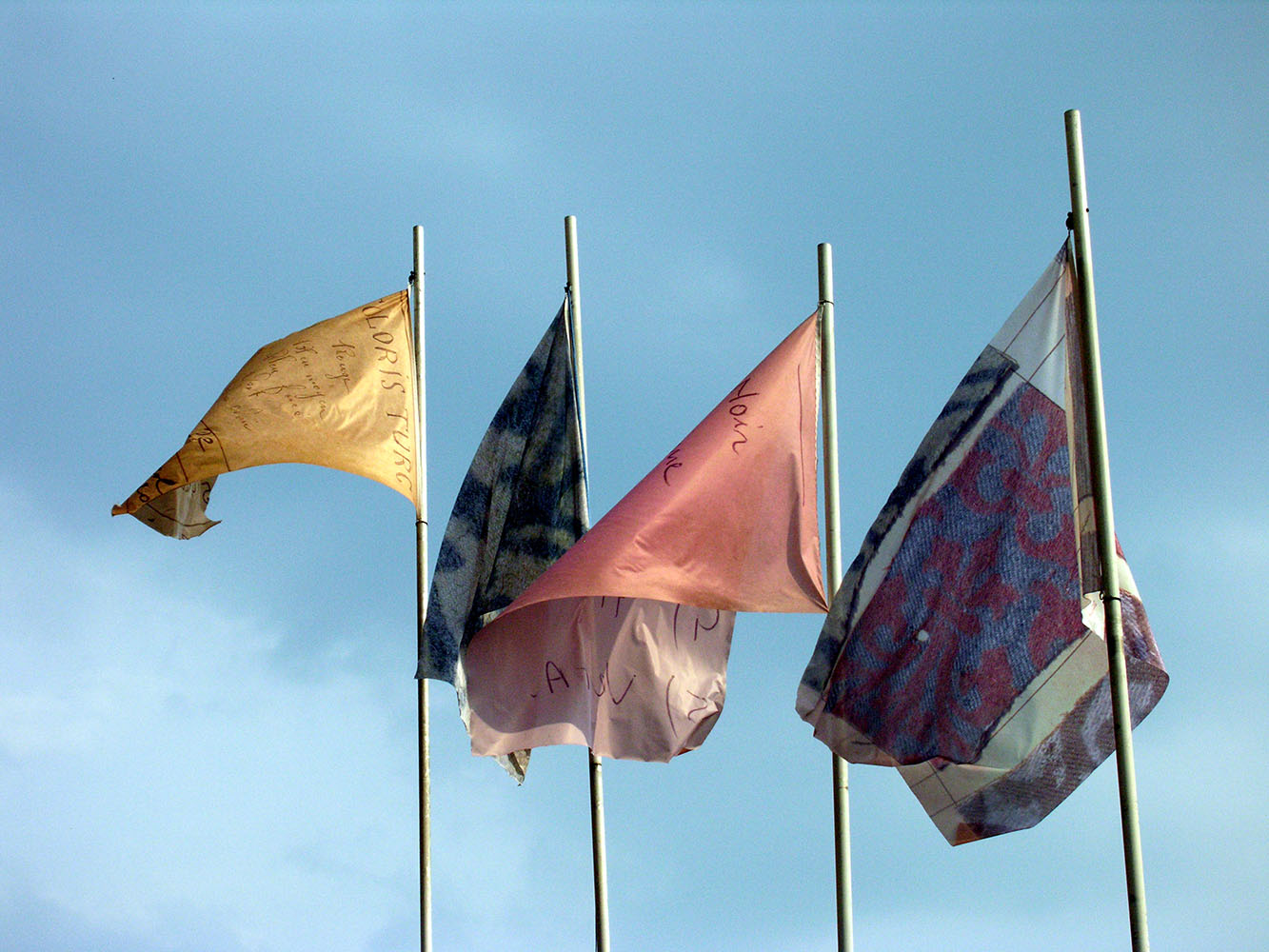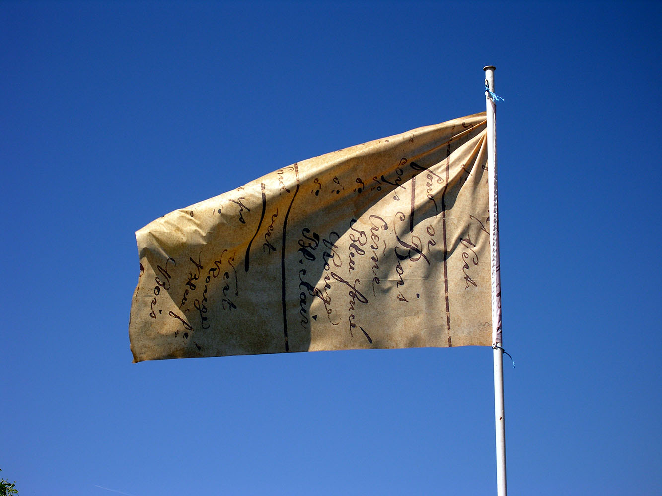 17 drapeaux, impression sur tissu drapeau, 150 x 225 cm chaque, installation château de Sedan.